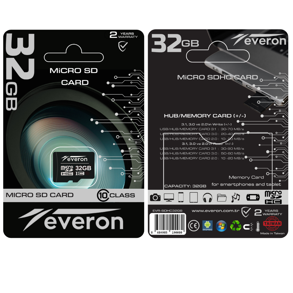 Everon 32GB Micro SD hafıza kartı, genel veri depolama, medya saklama ve hızlı veri aktarımı için ideal bir çözümdür. 4K video çekimi veya daha büyük veri saklama ihtiyacı olan kullanıcılar için 64GB ve üzeri modeller önerilir.